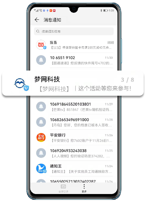 与传统的号段和单一的展现形式不同,在消息页形象展示方面,dcbox小金库app科技5G消息解决方案给予包含企业logoV露出及品牌信息植入功能,提高了品牌的社会认知度和用户识别度。而信息界面可自定义企业业务应用模版卡片,式样丰富,实现了用户到H5、小程序等界面的直接跳转,一键直达核心营销页面,让企业在短信收件箱这一营销入口就能带来直观的流量转化,增强客户对公司更信任。