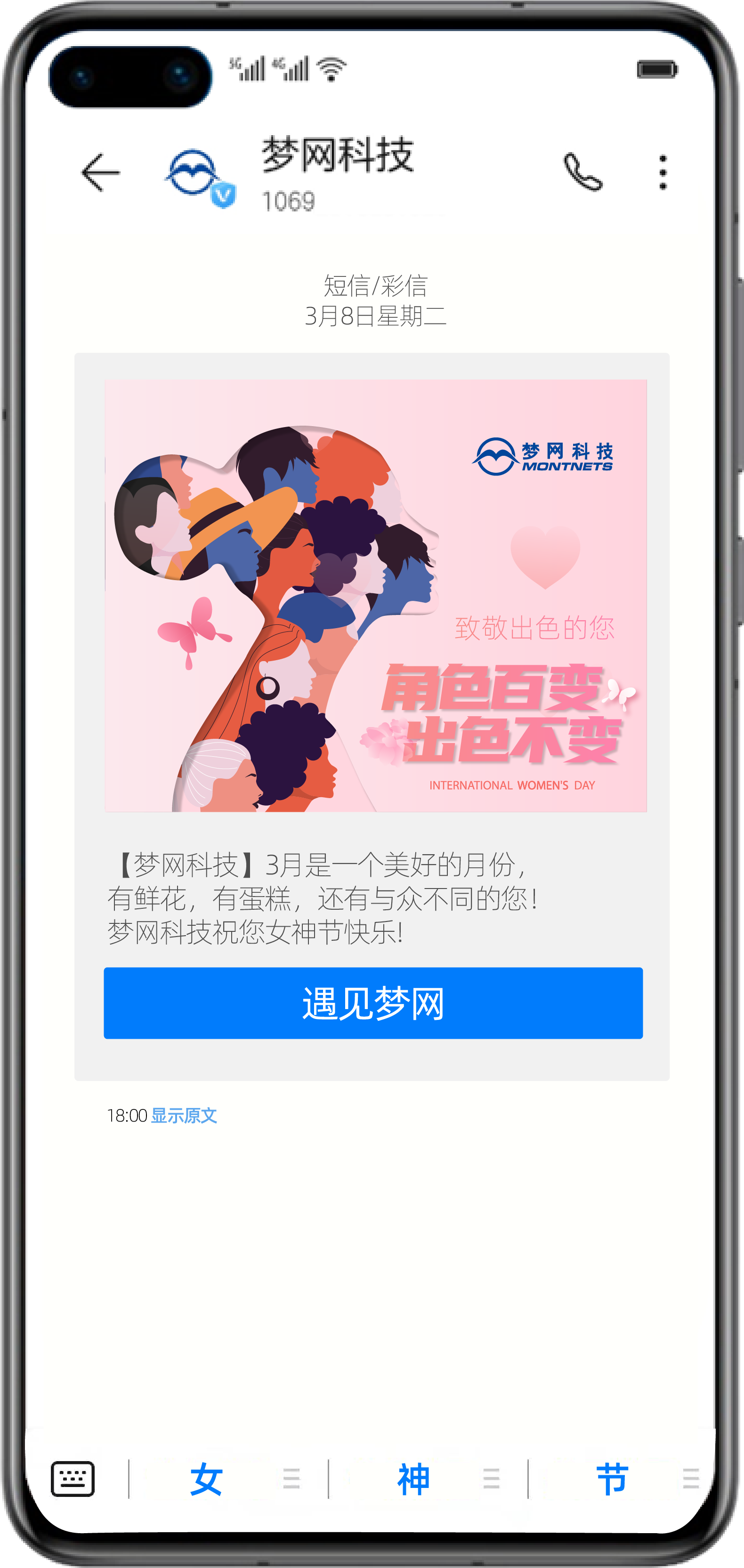 3.8营销活动为例,商家顺利获得自定义底部菜单为“女神节”活动主题造势,同时也为用户给予更直观的营销服务指引。用户点击便可实现APP、快应用、H5等多渠道应用跳转,形成了全流程一站式信息闭环服务。商家还能顺利获得品牌信息的有效露出令服务消息更贴合品牌价值,以优质的通信营销生态提升用户粘性,实现高效转化复购