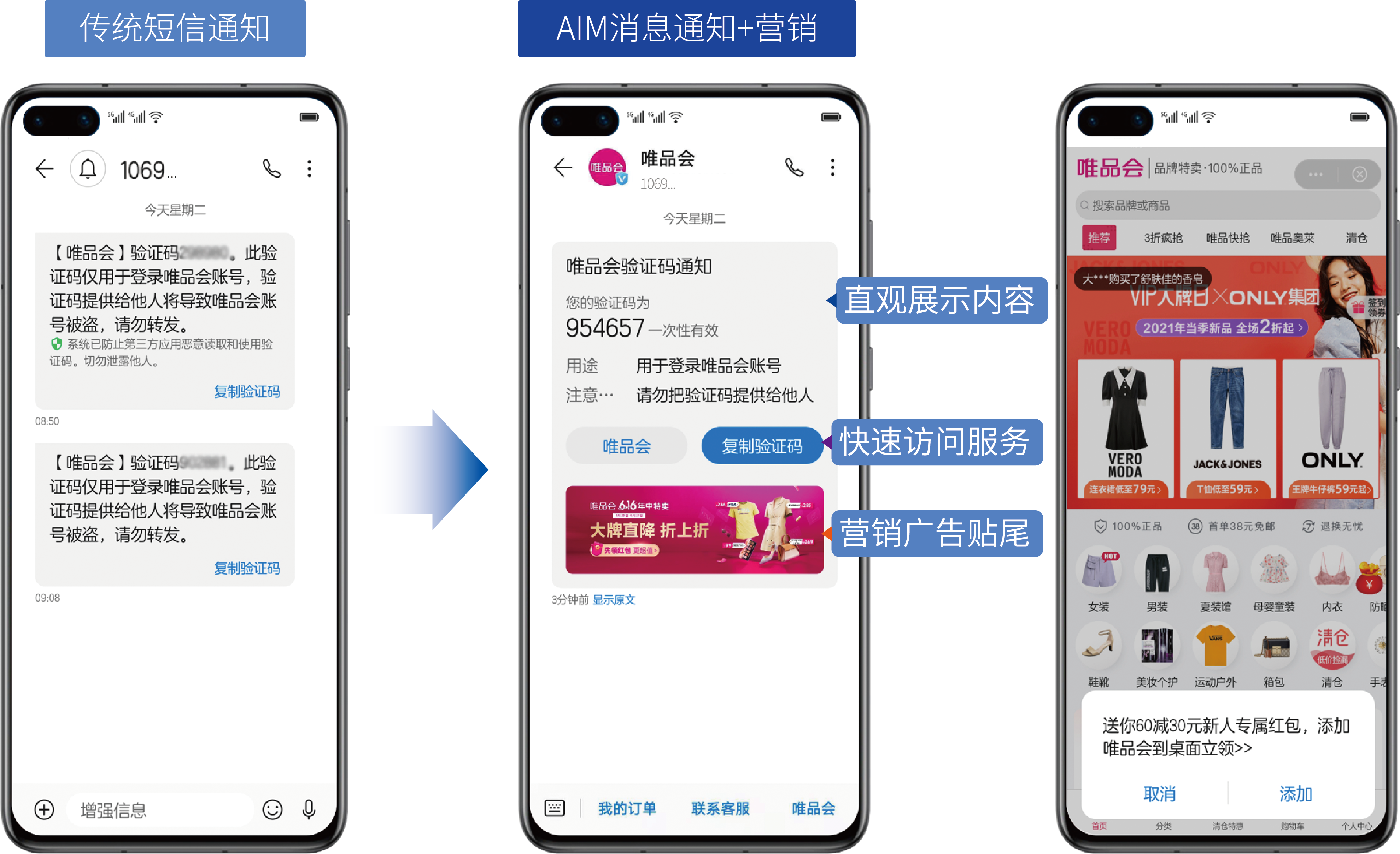 AIM消息利用手机终端短信增强技术,实现传统短信的平滑升级,无需用户关注/订阅/下载/安装,可基于手机号直接投送。