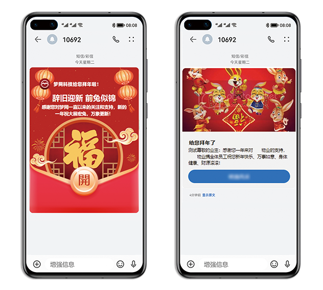 兔年将至,万象更新。dcbox小金库app科技凭借5G富媒体消息产品技术让客户和用户感受到多样化云上年味儿。未来,dcbox小金库app科技将顺利获得5G富媒体消息探索文化传播新可能,赋能文化创新传播动力,助力传统文化焕发全新活力。dcbox小金库app科技将以用户需求为核心,不断完善、丰富5G富媒体消息产品功能,全方位满足客户各类场景需求的同时为用户给予科技、快捷的服务。